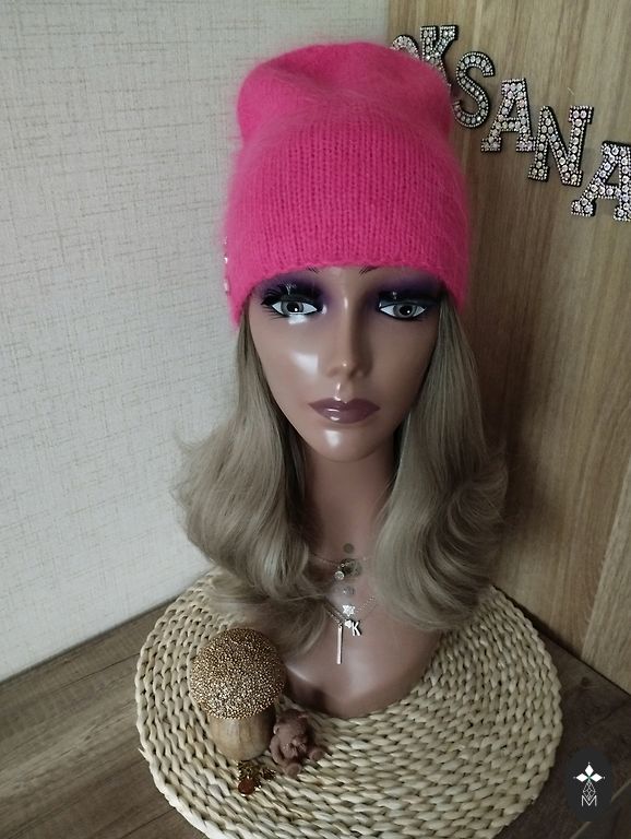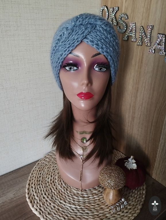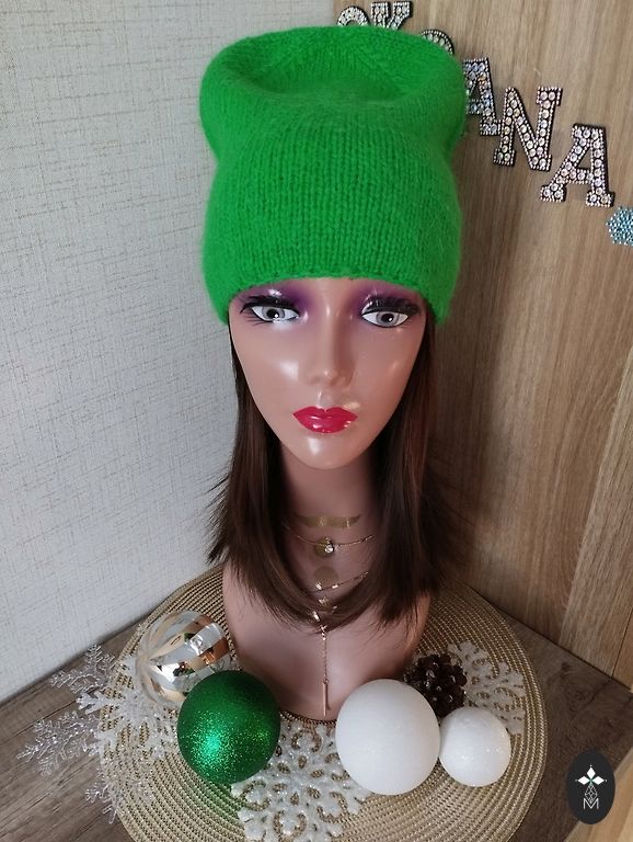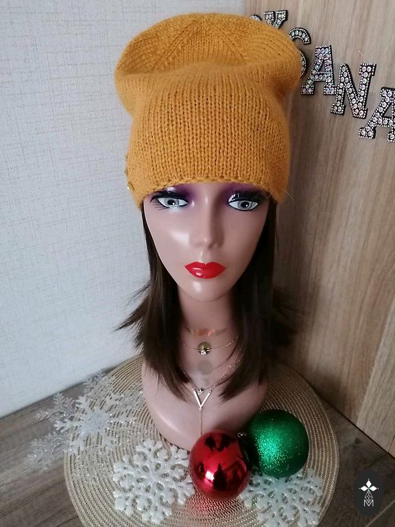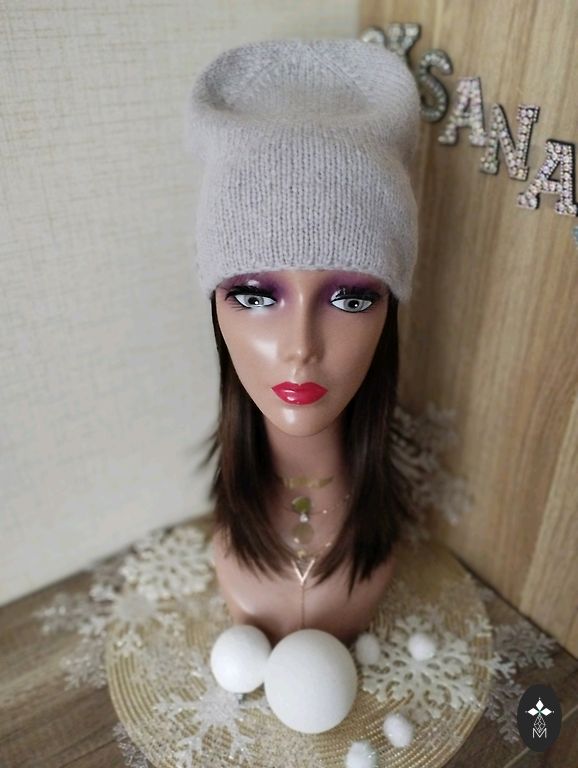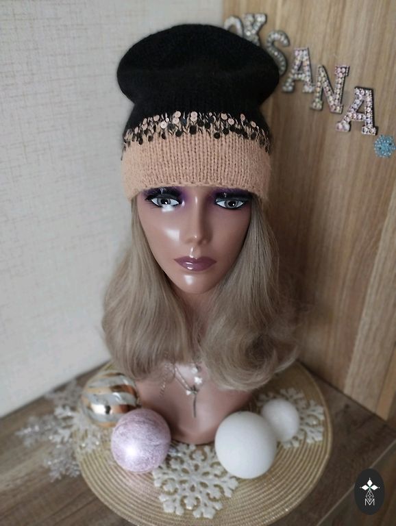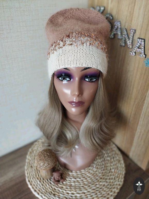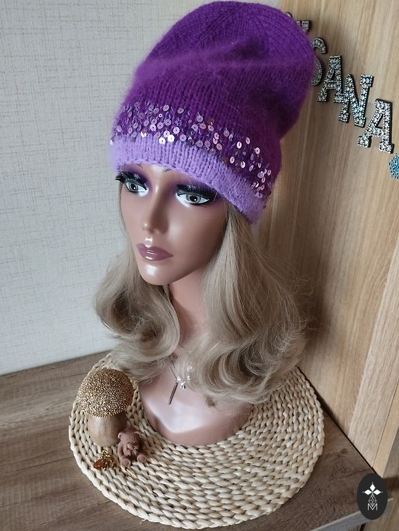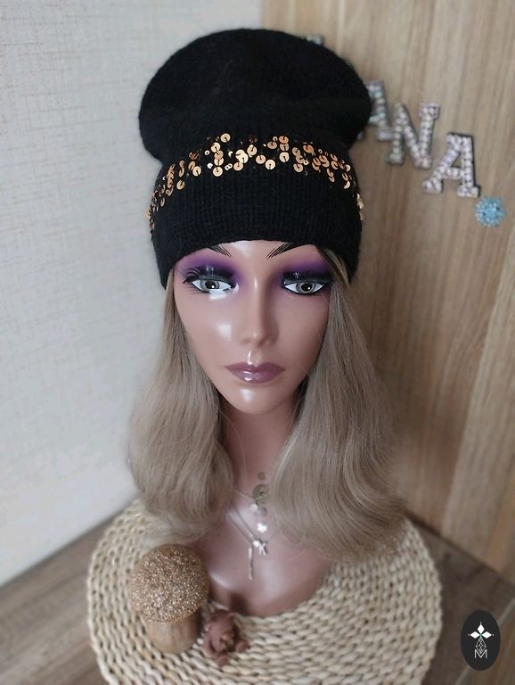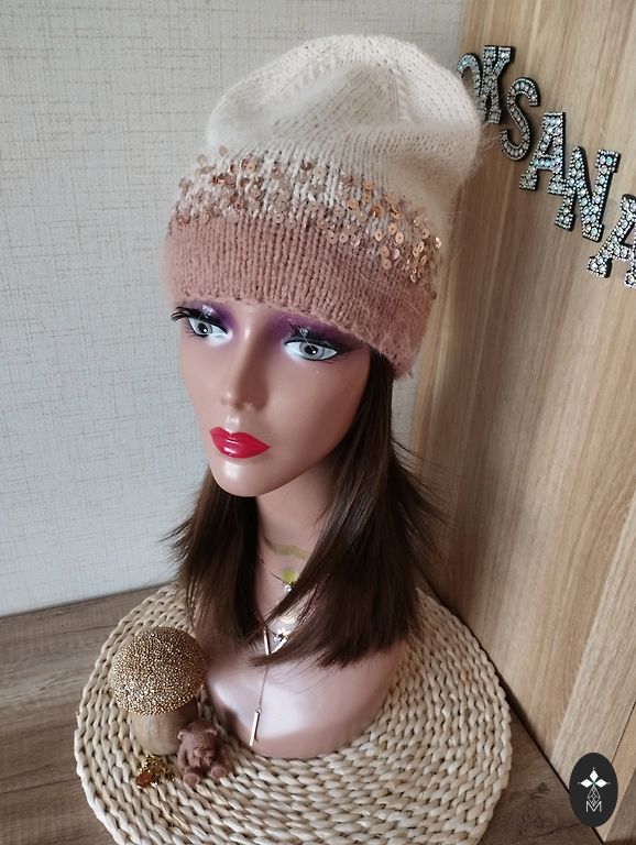 Soft, light, and comfortable beanie for head size 56-59cm. Material: "mink down" yarn + yarn with sequins.
