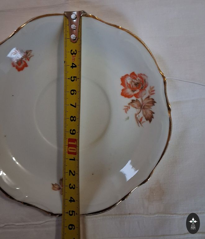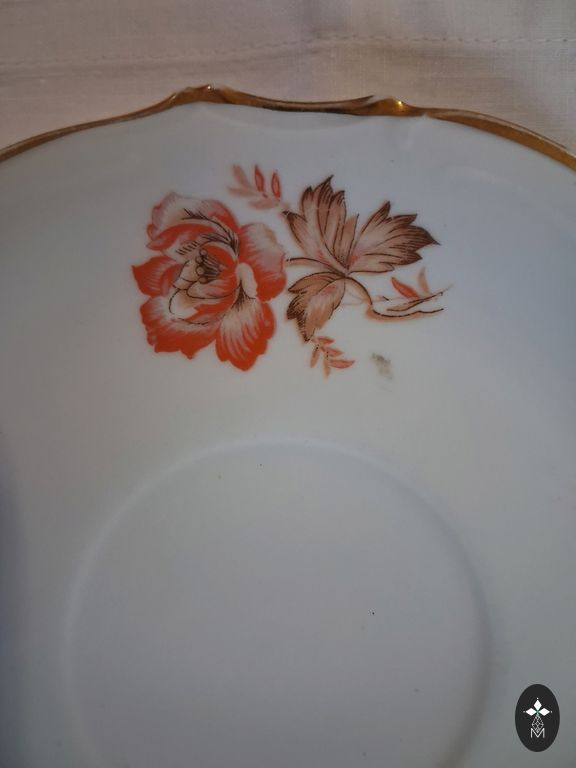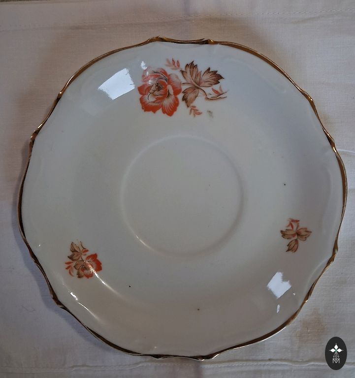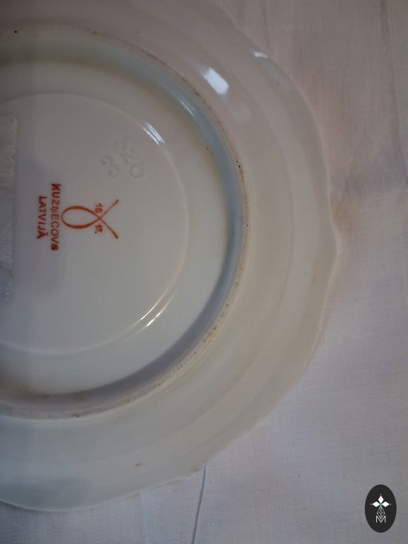 Набор тарелок с оранжево-коричневыми цветами и золотом, изготовленный на Рижском фарфоровом заводе в период СССР, с красной маркировкой RPR и знаком качества СССР. Один глубокий контейнер для горячих блюд или салатов - диаметром 23 см; 4 суповые тарелки - диаметром 23 см; 4 большие обеденные тарелки - диаметром 23 см; 4 маленькие обеденные тарелки - диаметром 17 см; 1 удлиненный контейнер для холодных блюд и контейнер для специй. Продается комплектом. Отправка + расходы также за хрупкий товар.