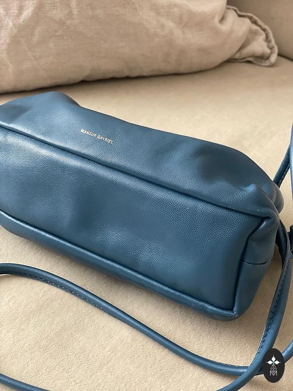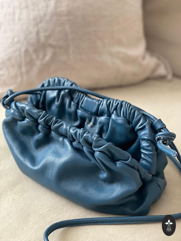 Blue thick leather bag. Handmade as a single piece. Purchased at Erika's workshop. Unlined, with a sewn-in pocket. The bag shows signs of use, but they only make the leather more beautiful. Dimensions approximately 28cm x 22cm.