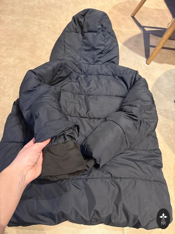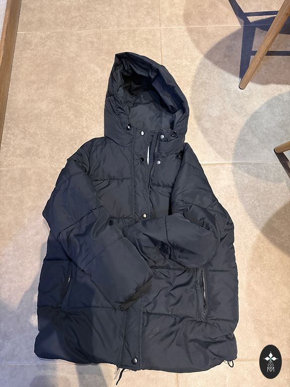 Cool oversized type jacket, defect in the picture, was torn, I fixed it as best I could, you can safely sew something else. Suitable for spring, also for our winters. Chest 62 cm, length 95 cm, shorter in the front. Stable L, but will also fit M - then looser.