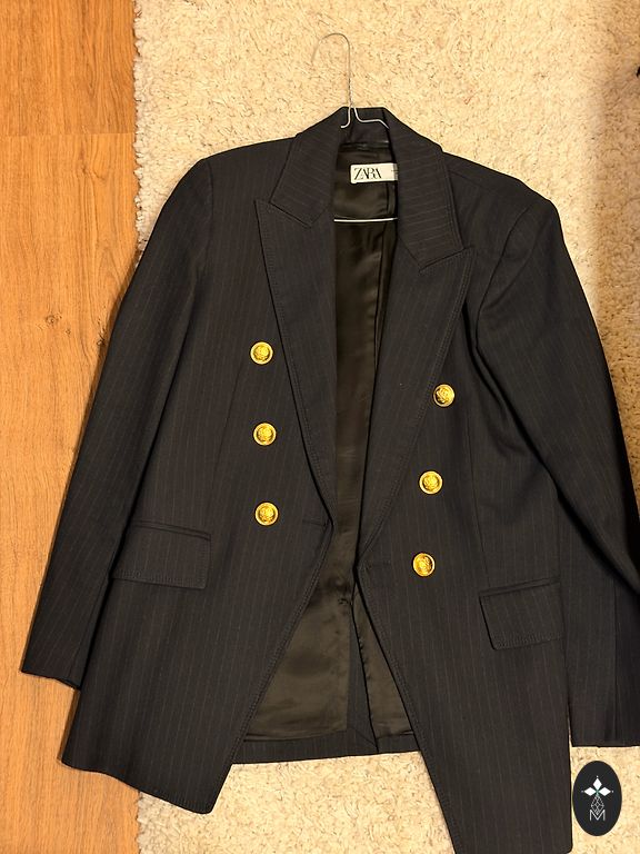 Švarkas - paltas. Išorė medvilnė. Su pamušalu. 3 sagos, iš kurių 2 paslėptos spaudžiamos sagos, 1 matoma saga. Tvarkingas, kokybiškas siuvimas. Ilgis nuo peties 80cm, atstumas tarp krūtinės 46cm. Nesitampo.