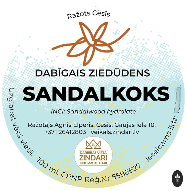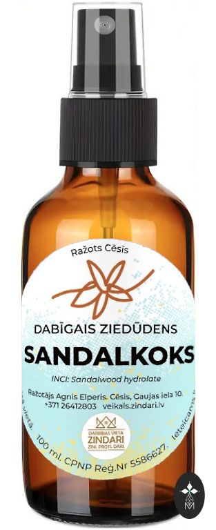 100% tīrs Sandalkoka (Santalum album) hidrolāts, iegūts ar tvaika destilācijas metodi no ilgtspējīgi iegūta koka.