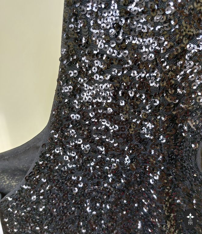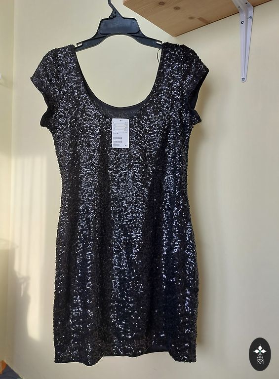 Sveikos mados damos! Siūlome naują, stilingą, blizgančią suknelę jūsų šventėms! 86 cm ilgio, krūtinės apimtis 45 cm, bet dar šiek tiek tempiasi:)