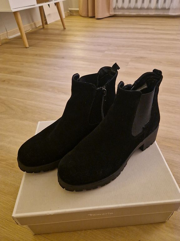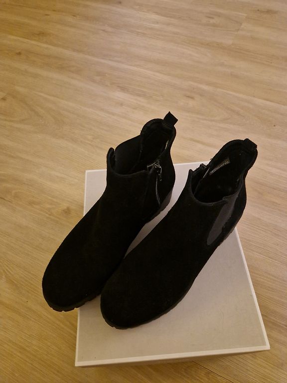 Pāris reizes uz pasākumiem vilkti skaisti zābaciņi. Zamšveidīgs materiāls. Papēdis 10 cm. 25,5 cm pēdiņai.