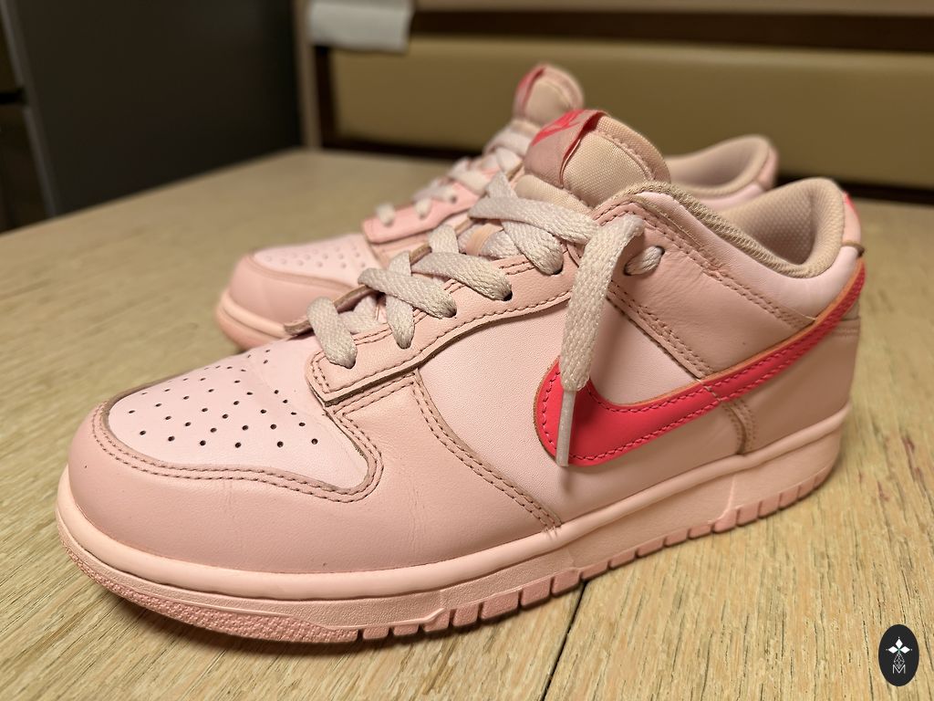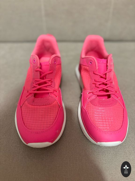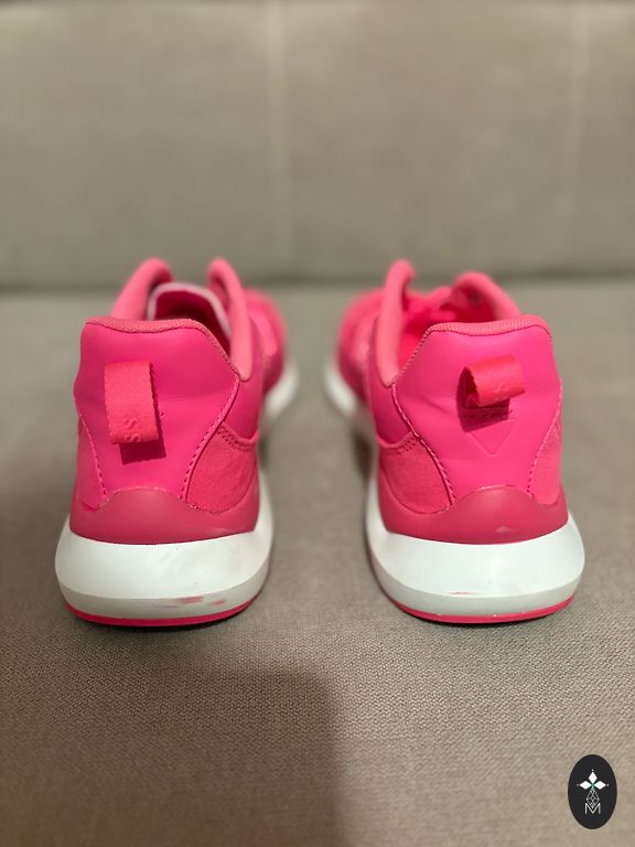 Jalatsid on roosa värvusega kangast materjaliga, valge tallaga ja kollase äärega talla ümber. Jalatsi külgedel on näha hõbedane Nike logo. Sees on jalatsid helekollase voodriga ja roosade paeltega. Jalatsid on kasutatud, kuid üldiselt heas seisukorras, väikeste kasutusjälgedega, mis on näha.