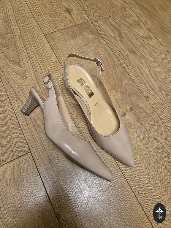 Beežid kingad 5 cm kontsaga. Sisetald 26 cm. Natuke liimiga määrdunud sisetald - pildil näha.