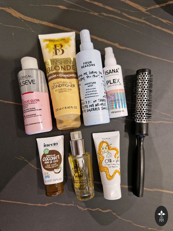 Loreal šampūnas šviesiems plaukams. Iš 750 ml liko apie 300 ml daugiau. Ir Schwarzkopf Gliss priemonė plaukų atkūrimui. Buteliukas beveik pilnas.