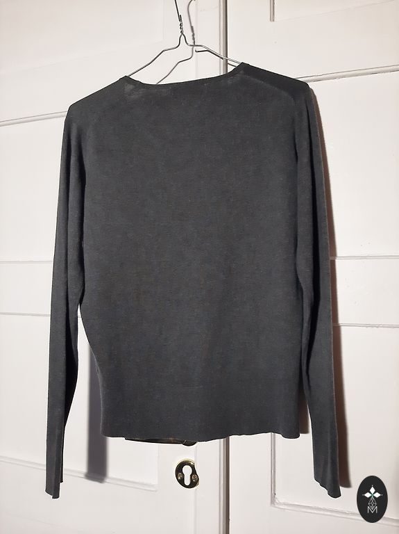 Very, very soft knit, silver finish, small slits on the sides. Gray with a blue tint. Excellent condition, no defects. Washed and steamed.