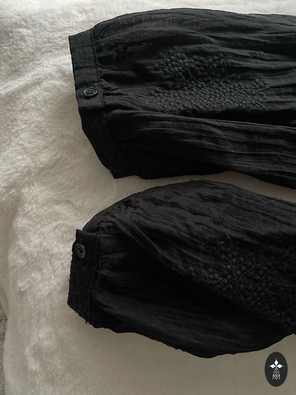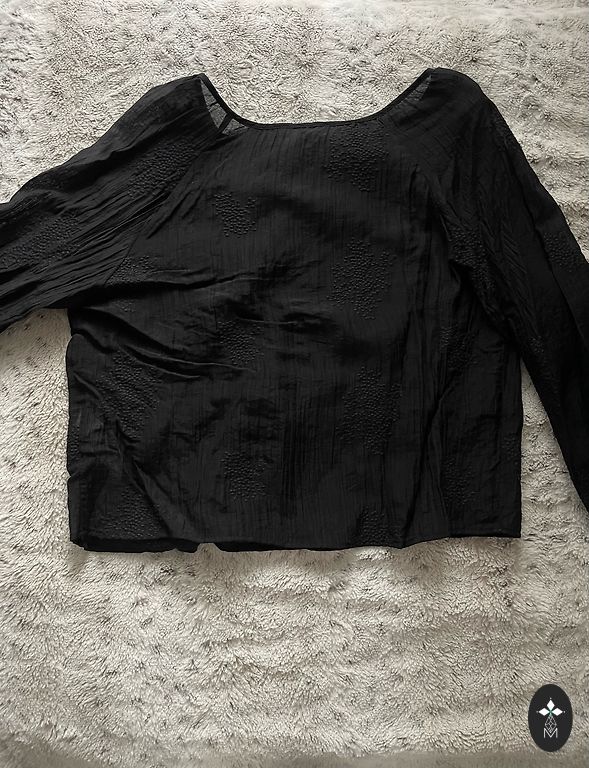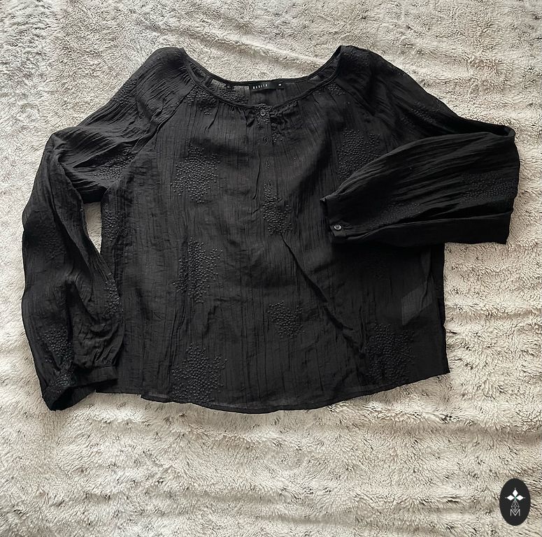 Ļoti skaista blūze ar volānveidīgām piedurknēm. Piedurknes garas, aktuālas, līdz plaukstas vidum.