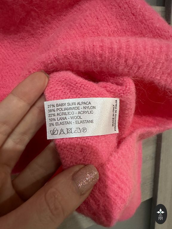 Очень хороший состав, мягкий, тонкий свитер с рукавами 1/4, разрезы по бокам. Эластичный.