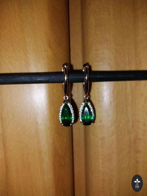 Beautiful green zircon earrings with gold plating. The earrings feature 585 rose gold plating. The earrings have a secure clasp and do not tarnish due to the plating. A classic charm for everyday wear or for a more formal event.
