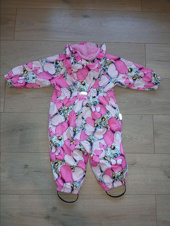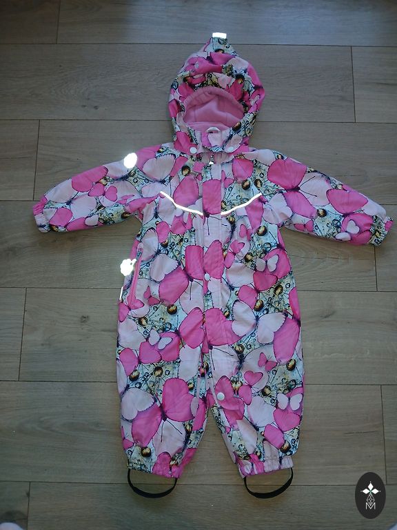 Удобный комбинезон для активного ребенка. Легко надевается, в нем легко двигаться. Подойдет для теплой зимы и весны. Носили два сезона. Можно подворачивать брюки и рукава, если ребенок еще не ходит. Ничего не поцарапано, только внутри видны следы использования (подкладка не полностью белая). Размер 74.