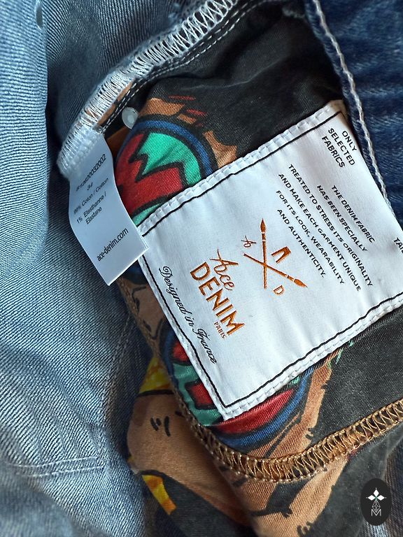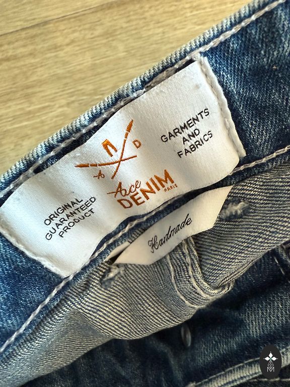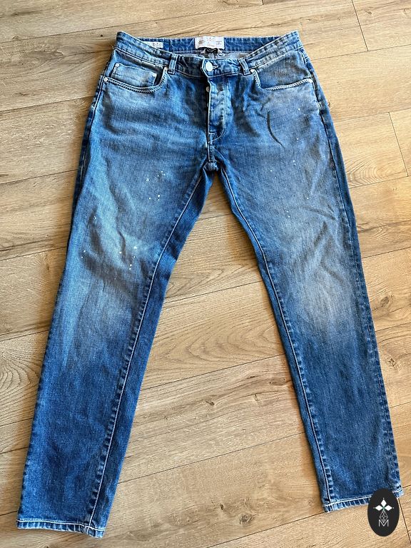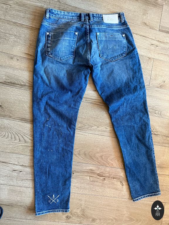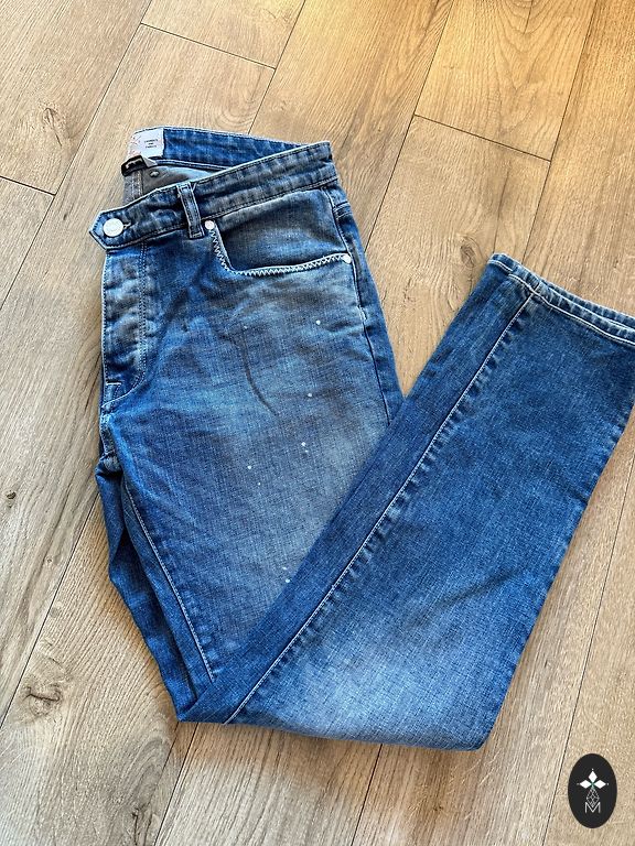 Elastīgas džinsas. Viduklis - 40 cm × 2, Garums - 107 cm, iekšējā puse - 81 cm.