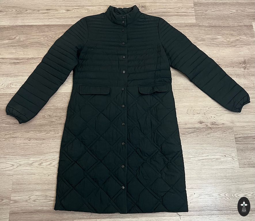 Color dark khaki. Effective zipper. Stable M size. Pictured on a 177 cm height. Shoulder section 43 Chest section 55 x 2 Sleeve 64 Length 107 No down. Meeting in Riga center or sending.