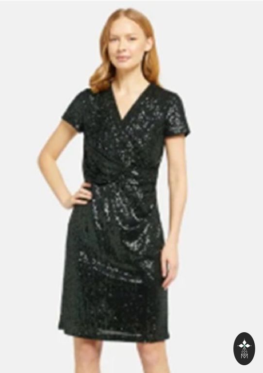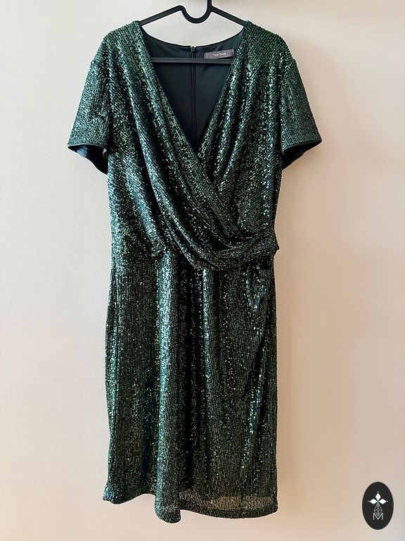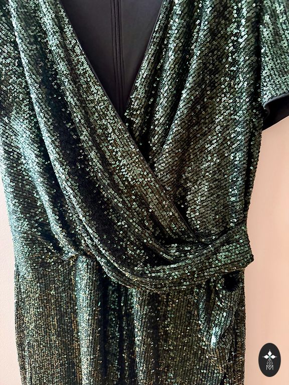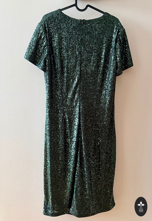 Elegant dress in emerald green shade. The design is fitted at the top, slightly raised at the waistline, and flared at the bottom. The material is stretchy with a velvety texture and incorporates a silvery metallic thread that shimmers like pearls under lighting. Size: XL Length-118cm; bust circumference-98cm; waistline-87cm; hips-120cm; sleeves-64cm; shoulders-40cm