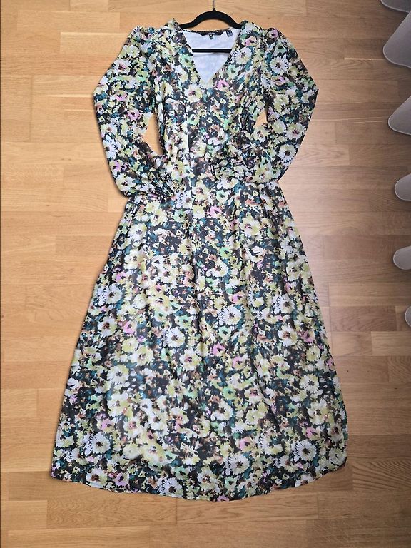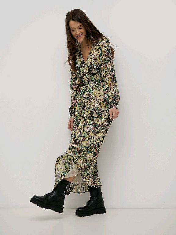 Spilgti dzeltena kleita ar izteiksmīgu rakstu, garām piedurknēm un sievišķīgu, plūstošu siluetu. Pogājama priekšpusē, ar viegli akcentētu vidukļa līniju, kas skaisti izceļ figūru. Audums viegls un patīkams, kleita labi krīt un izskatās koptā, sakārtotā stilā.