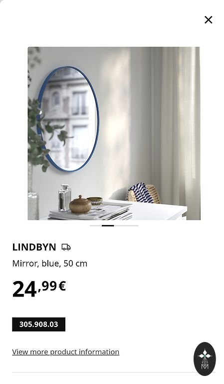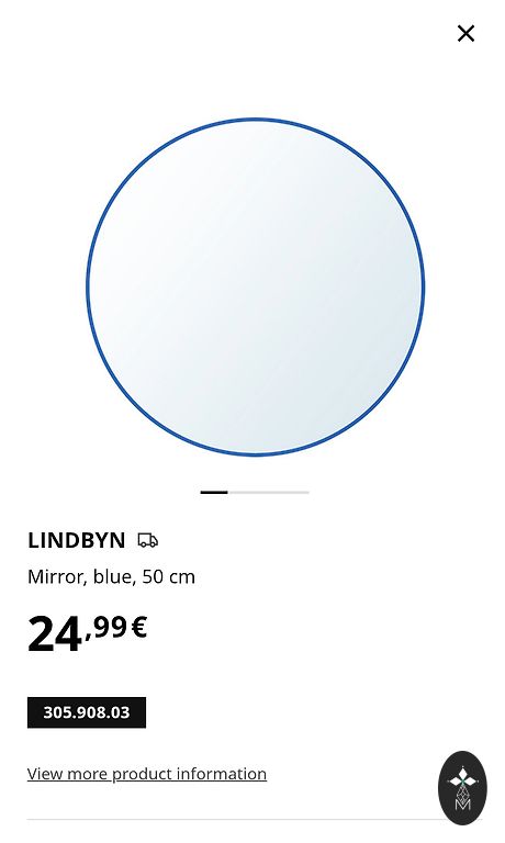 Naujas veidrodis melsvai rėmelyje su sieniniais laikikliais.
