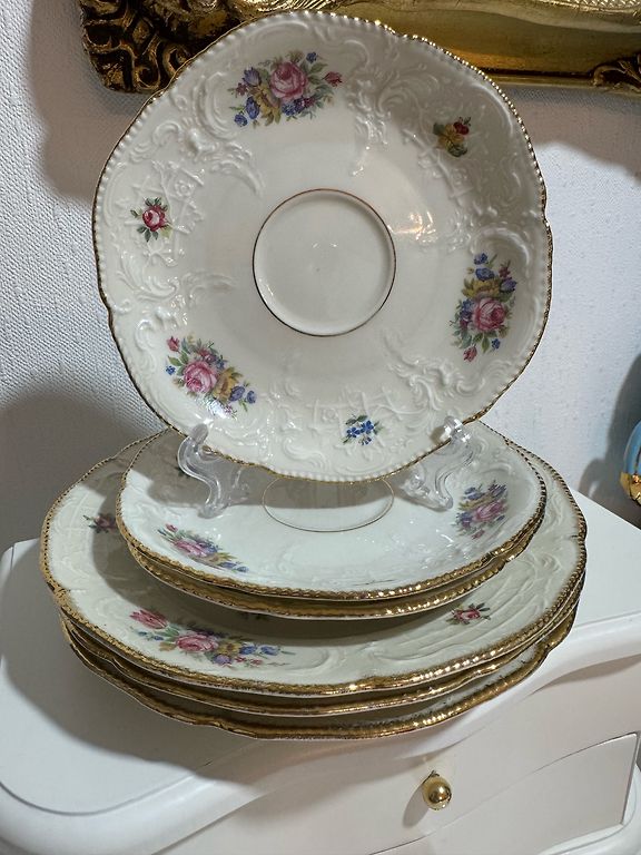 Diameeter ~30,5 cm. Reljeefne rokokoostiilis serv, kullatis, lilledega dekoratsioon.