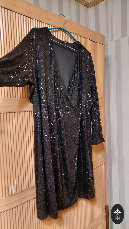 Bies&B8 36. suuruses poolpikk kleit kuldsete niitidega tikitud alumise äärega, alumine äär veidi kohev. Tagant seotav vöö.