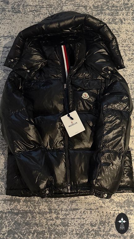 Размер m пуховик с отстегивающимся капюшоном или отделкой капюшона. Пропитанная ткань. Длина немного ниже талии. По бокам карманы и еще с застежками.