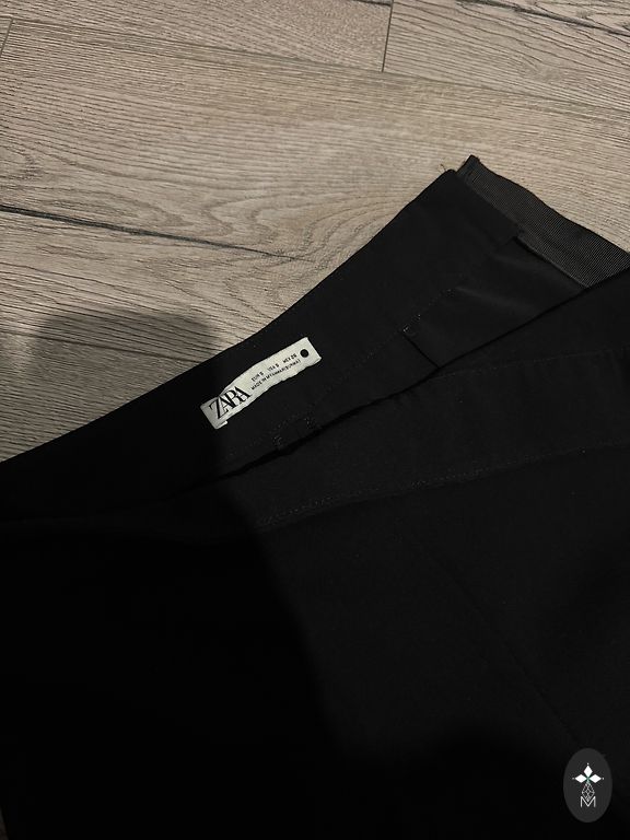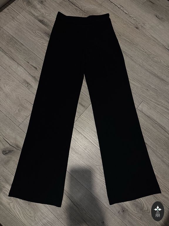 Juodos kelnės su aukštu juosmeniu ir plačiomis klešniamis. Tinka XS ir S dydžiui. Kelnės buvo tik pasimatuotos. Be defektų.