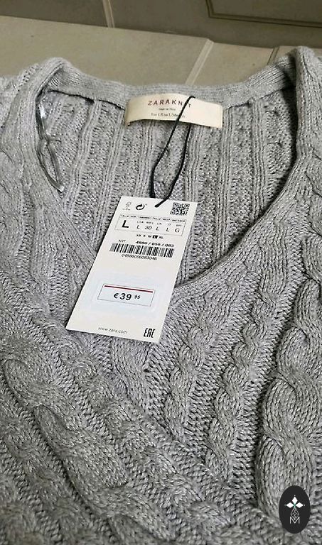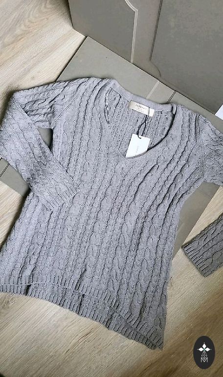 Новый серый свитер Zara с косами. На бирке указано L, но больше соответствует M. Длина свитера 62, а задняя часть 65, от подмышки до подмышки 50.