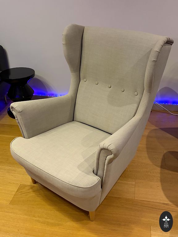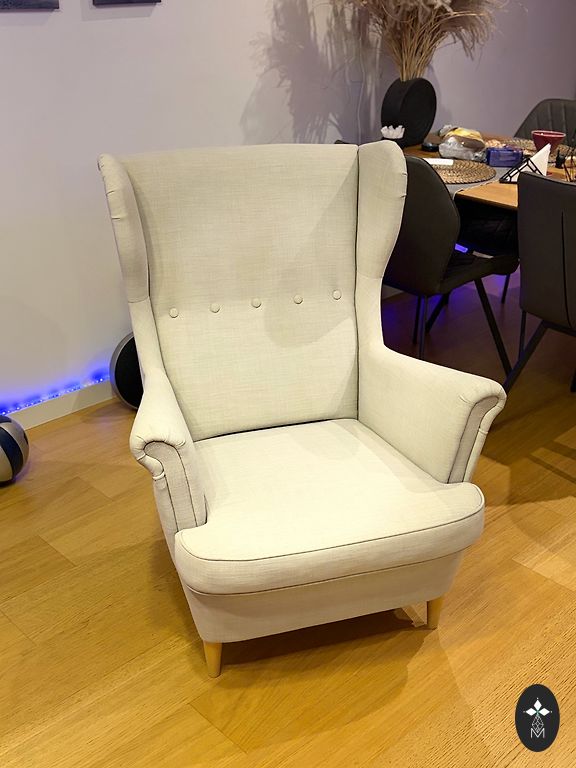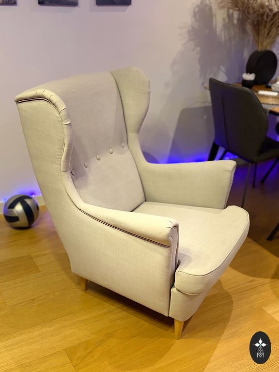 Comfortable and elegant lounge chair with a matching ottoman. Upholstered in white leather, which is not only visually appealing but also practical and easy to maintain for everyday use. A high-quality replica with a stable construction and good seating comfort. The chair is compact yet very comfortable – perfect for relaxation, reading, or as an accent in the living room or office. Comes with an ottoman that provides additional comfort. Delivery within the Riga area is possible upon agreement.