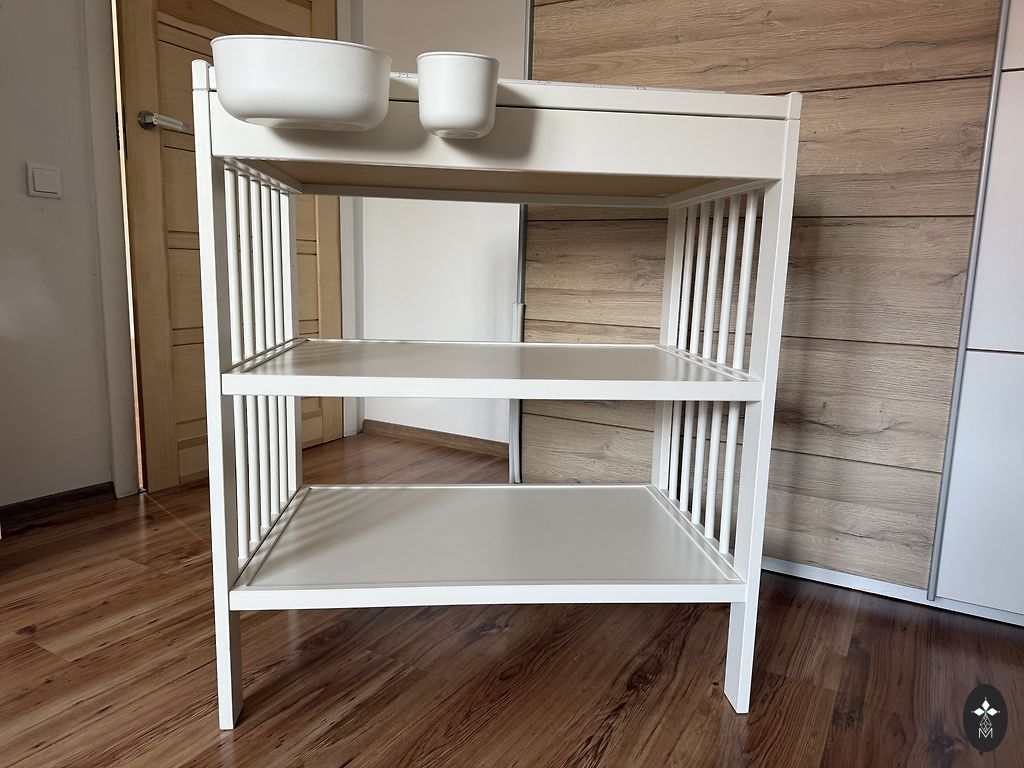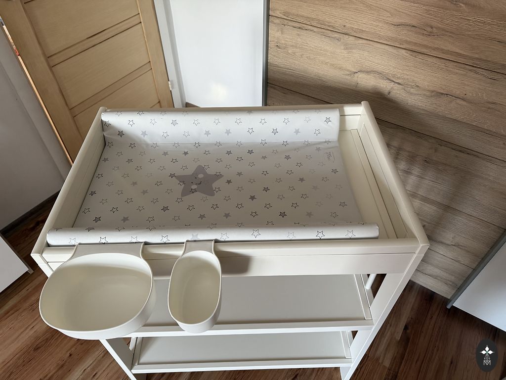 Praktiškai nauja, labai mažai naudota, nes kasdien naudojome dar vieną. Pridėsiu IKEA Vädra pervyniojimo paviršių ir IKEA lentynėles, pritvirtinamas prie komodos šonų, kasdieniams smulkiems daiktams (čiulptukams, tepaliukams ir pan.) Komodos šonui šiek tiek nusitrynusi spalva vienoje lentynėlės pusėje, bet to nematyti, jei pritvirtinsite papildomą jungtį, kad gautumėte didesnį paviršių (pridedama komplekte). Yra TC Spice – oro uosto rajone.
