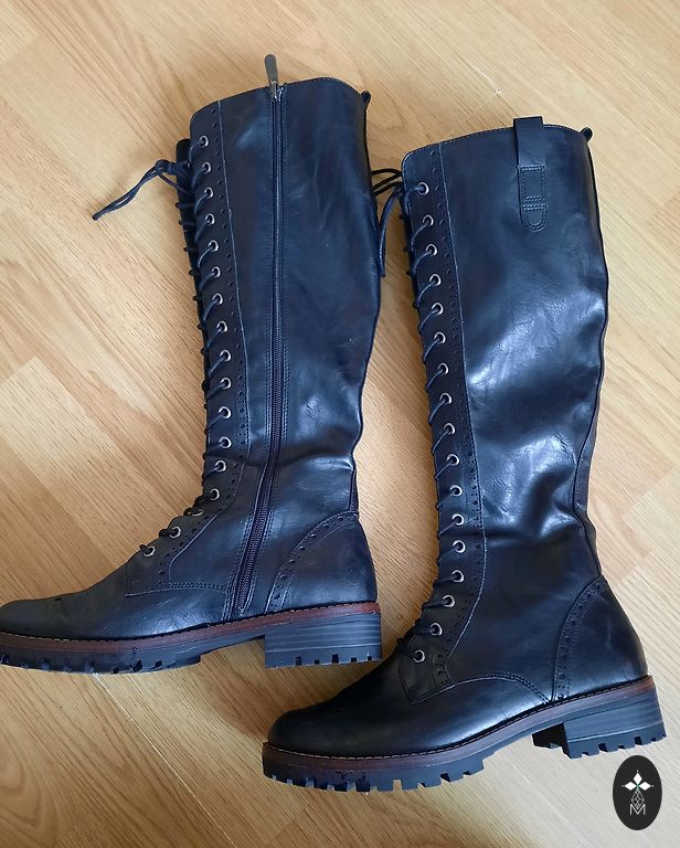 Melni, stilīgi virs ceļa zābaki ar masīvu papēdi un platformu. Pieguļoša, elastīga stulma skaisti izceļ kājas līniju un nodrošina komfortu valkāšanas laikā. Stabilais papēdis ļauj justies droši ikdienā, savukārt platforma mazina papēža augstuma sajūtu. Universāls dizains – lieliski sader gan ar kleitām un svārkiem, gan ar džinsiem vai tunikām.