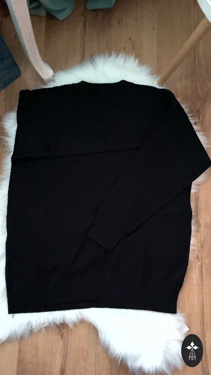 Pečiai 50 cm, krūtinės apimtis 114 cm, rankovės 68 cm, ilgis 68 cm. Sudėtis 75% vilna, 25% medvilnė. Pristatymo išlaidas padengia pirkėjas.