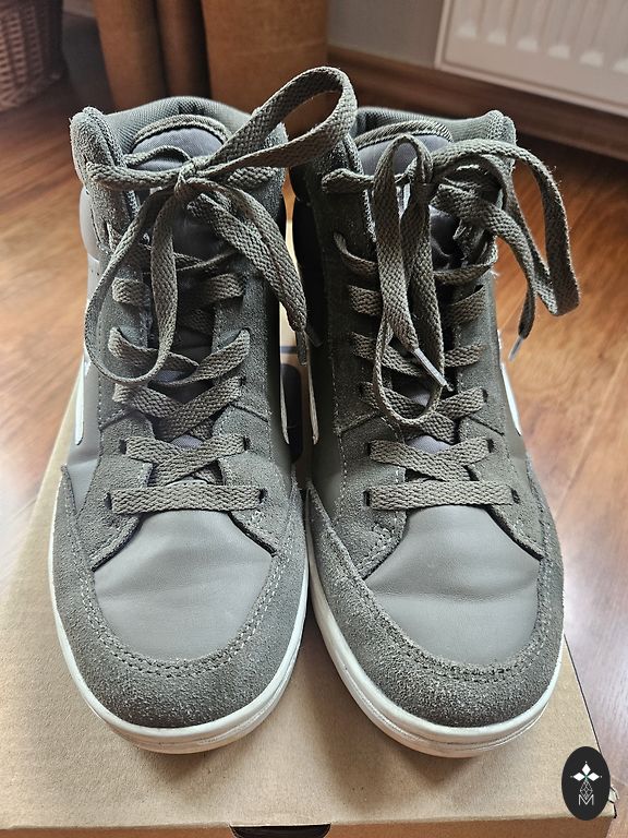 Aukšti batai, vidutiniškai šilti. Plotį reguliuojanti guma, užsegimas su lipuku. Yra nedideli įbrėžimai ant nosies.