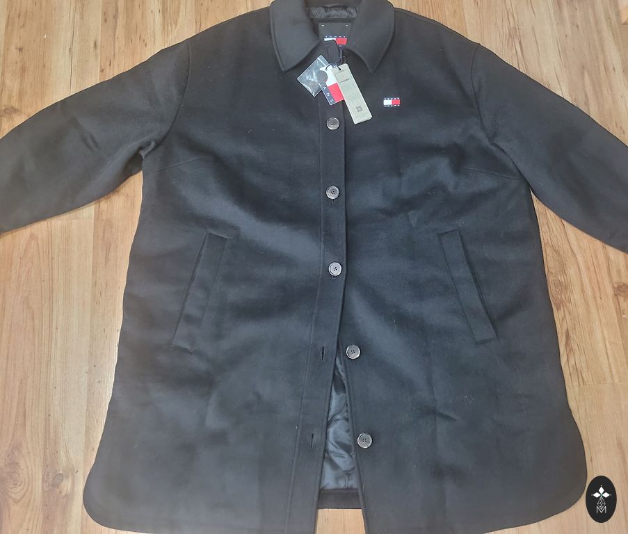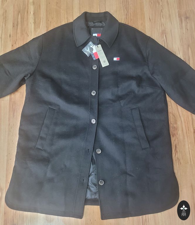 Dygsniuotas paltas, tiesus apatinis kraštas, gobtuvas su stovinčia apykakle, gobtuvas su virvele, gofruotas apatinis kraštas, dvipusis užtrauktukas, šoninės kišenės su užtrauktukais. Ilgis 90 cm, krūtinės apimtis 120 cm. Pristatymo išlaidas apmoka pirkėjas.