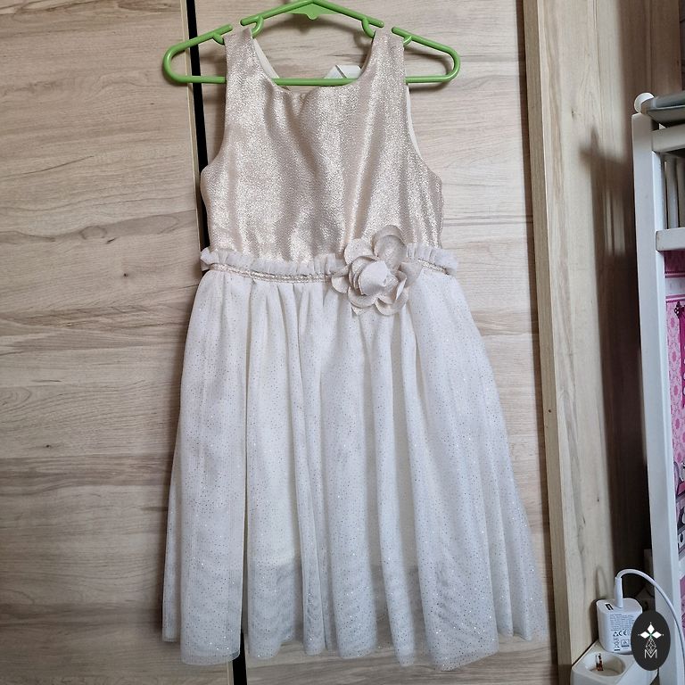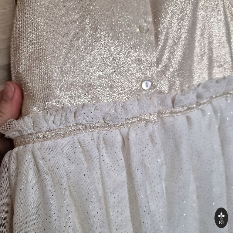 Dress is almost like new. No defects. Size 92. I am including festive socks with bows.