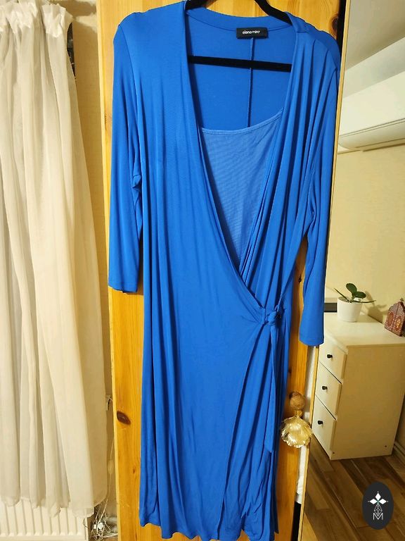 Sieviešu kleita maigi zilā krāsā, izmērs L. Kleita no blīva žakarda, piedurknes no šifona ar dekoratīvām saitēm.
