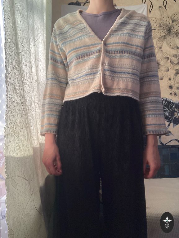 Adīta kokvilnas jaka, piedurknes 3/4, garums 50cm, izmērs franču 40, intern M. Krāsa dzeltena(sinepju tonis)