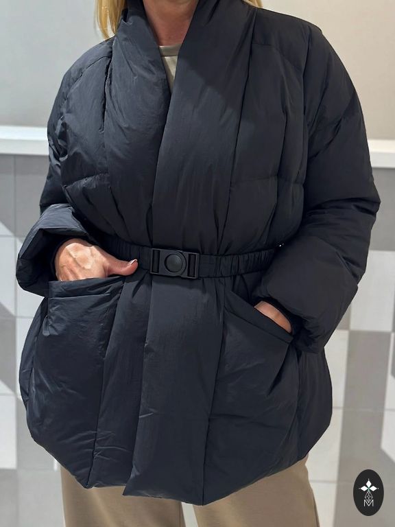 Vähe kantud must „Joutsen“ sulejope. Kapuuts, mida saab kanda krae-stiilis. Usaldusväärne tõmbluku ja nööpidega kinnitamine. Välised ja sisemised tõmblukuga taskud. Varrukad mansettidega, varruka pikkust saab reguleerida. Täidis - 100% sulg. Suurus - L. Tootmine - Soome.