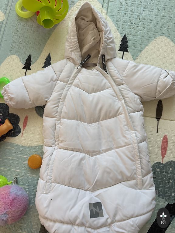 Šiltas, patvarus žieminis kombinezonas. Naudojimo požymiai - šiek tiek nusitrynusi medžiaga tarpkojėje.