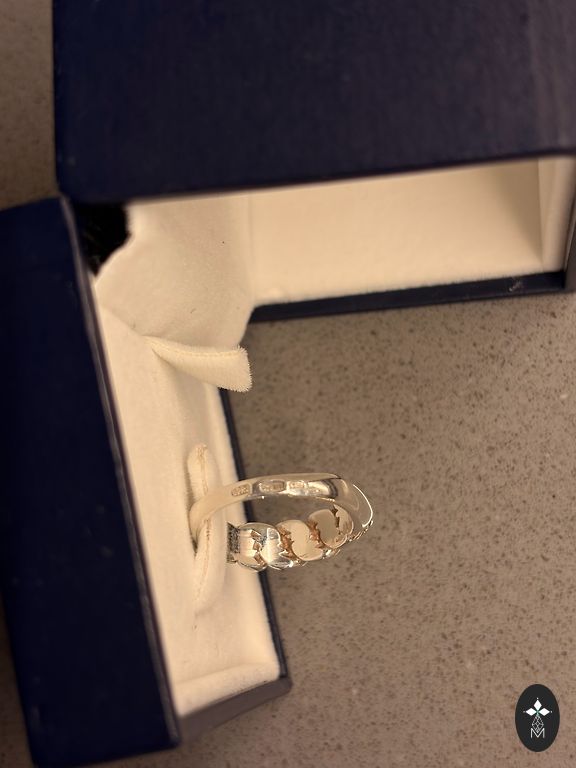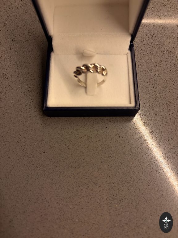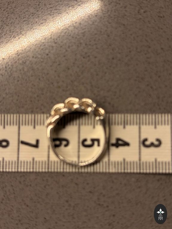 Žiedas naujos prekės būklės, galima sakyti visiškai naujas, nes dėvėtas galbūt du ar tris kartus. Kadaise jis buvo įsigytas ir tiesiog stovėjo spintoje. Dabar po matavimo tapo truputį per mažas ir pasiruošęs keliauti į savo naujus namus!