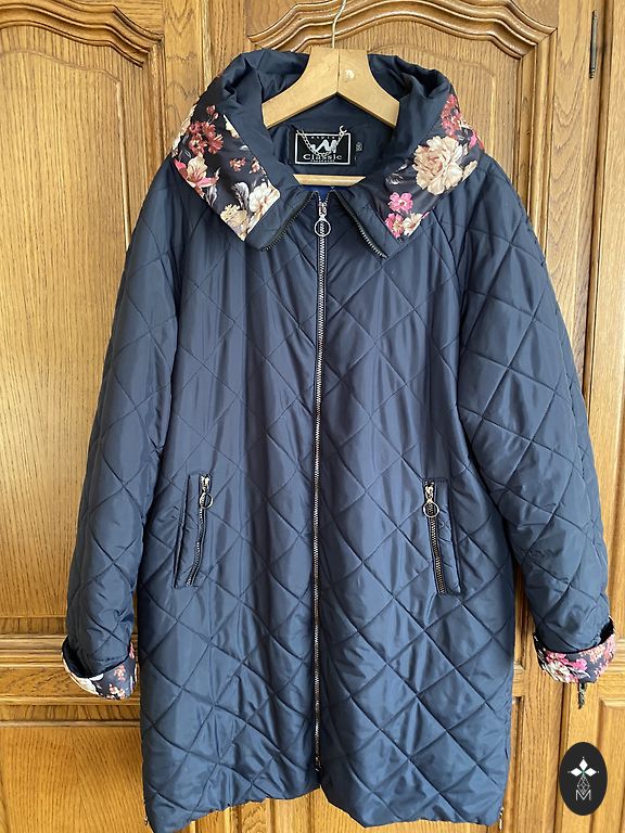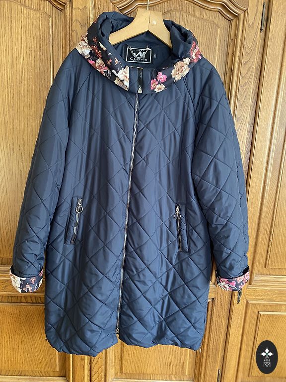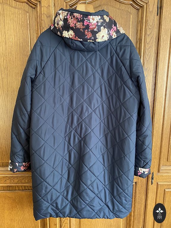 Interseason - autumn, warm winter coat with a black, quilted interior. The coat can be worn on both sides, as there are pockets on both sides. Two-way zipper, pockets with zipper. The coat is new, practically unworn, worn a few times. I provide exact measurements. Measured closed. Underarm 66×2cm, shoulders 51cm, sleeve 64.65cm, length 92cm, waist 62x2cm, bottom 74×2cm.