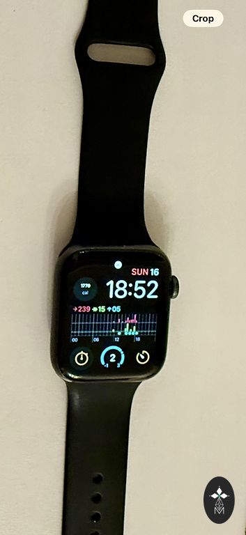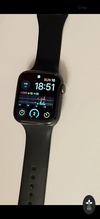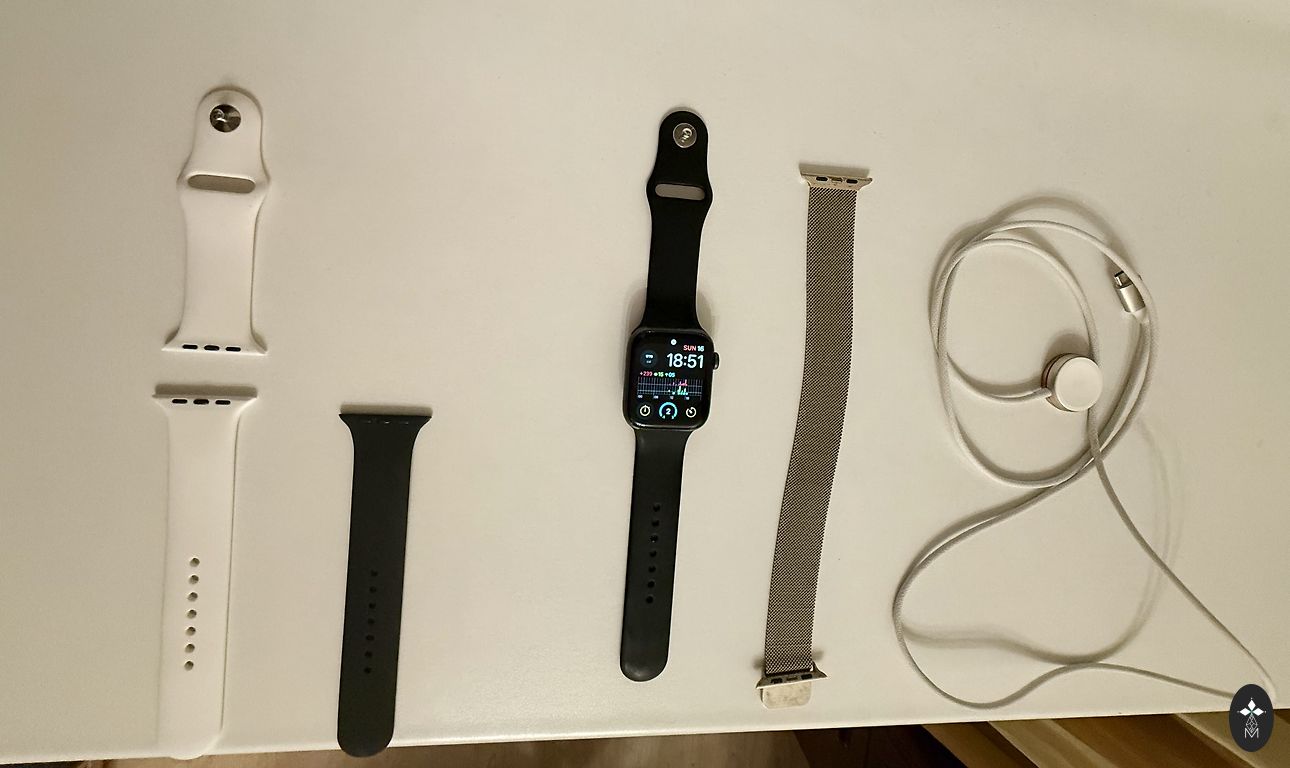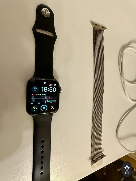 44 mm. 2020 metai. Su dėžute ir įkrovikliu. Nauja nenaudota originali apyrankė, komplekte su ilga ir sidabrine apyranke. Iš trūkumų tik nedidelis įbrėžimas ekrane, matomas tik tamsiame ekrane. Veikia puikiai. Baterijos talpa 81%.