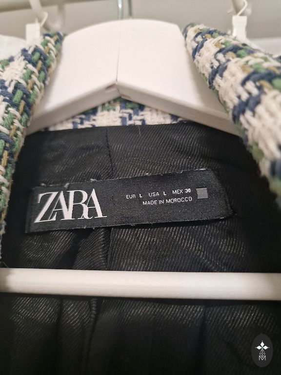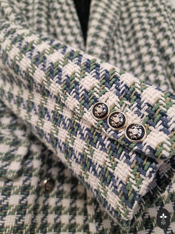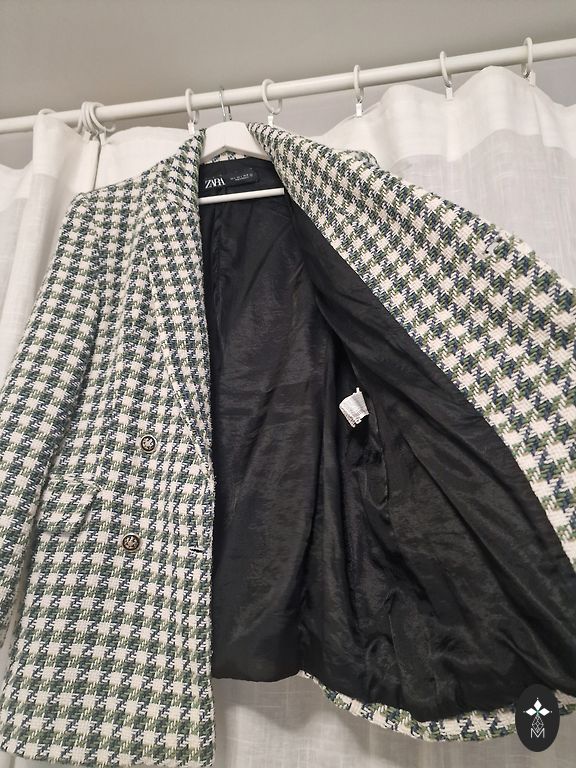 Short, colorful jacket made of thick fabric. Fabric composition: cotton (42%) and polyester (58%), lining – cotton (19%), polyester (81%). Fastened with 5 snap buttons. It has pockets. 3/4 sleeves (47 cm). Jacket length – 61 cm. UK 16