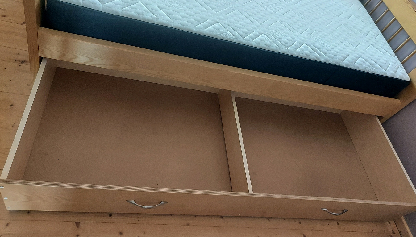 Alder natural wood bed with a storage box and two nightstands. Mattress size 140x200, not included. There are some scratches from use, overall everything is in excellent condition. Located in Riga. I can deliver, upon prior agreement.