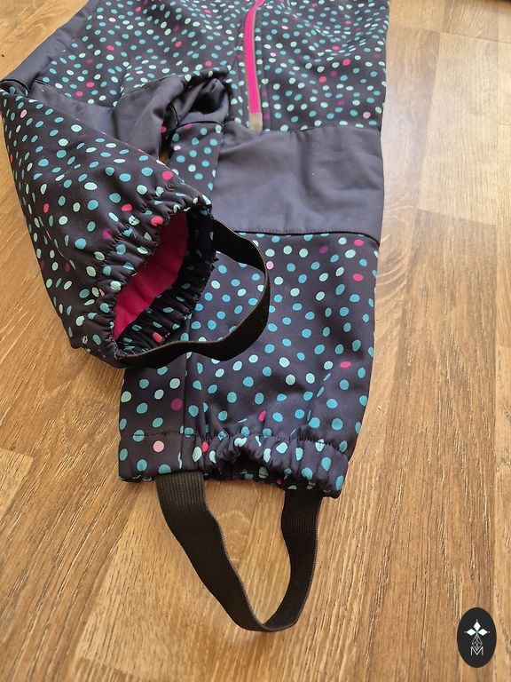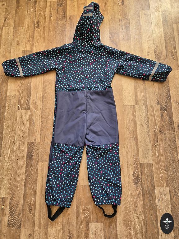 Двухкомпонентный комбинезон softshell для девочки, есть недостатки - резинки на ногах нужно заменить, пришиты. Цвет куртки выцвел.