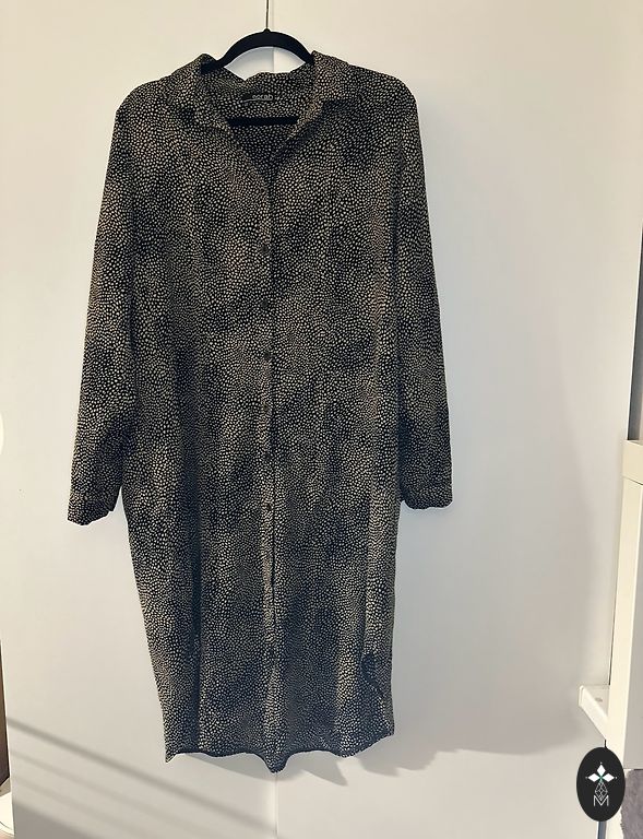 Shiny fabric blouse, buttoned over the left shoulder. The collar can be adjusted to how open you want it. Ribbed fabric structure. The color looks more beautiful in real life. Worn a couple of times.