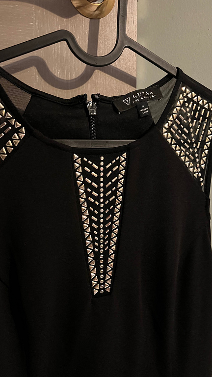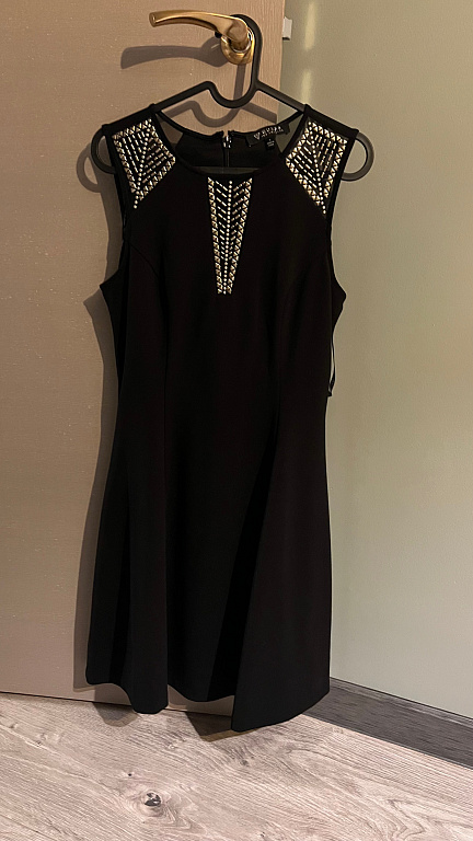 Žavinga suknelė, kurią galima dėvėti tiek su dirželiu, tiek be jo. Šonuose taip pat yra kišenės. Pečių plotis 44 cm, po pažastimis 58 cm, klubų plotis 62 cm, ilgis 100 cm.