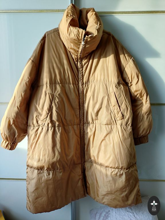 Lieliska pagarināta dūnu jaka. Silta, viegla, ar dubulto aizdari priekšpusē. Krāsa atbilst bildei no interneta. Atbilst izmēram L, labi būs arī lielākam M. Sūtīšana pēc Andeles cenrāža.