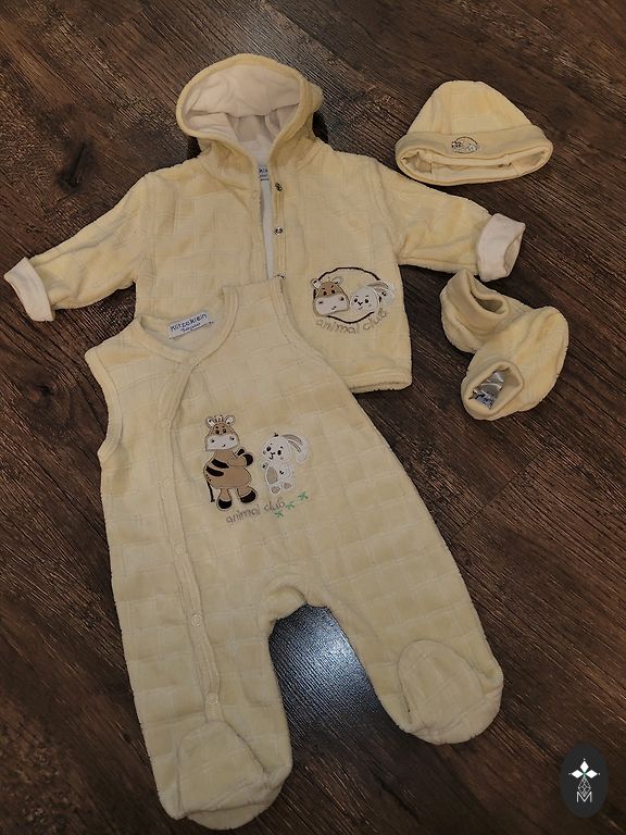 Fleece jumpsuit with foldable foot and hand sections, with a zipper closure.