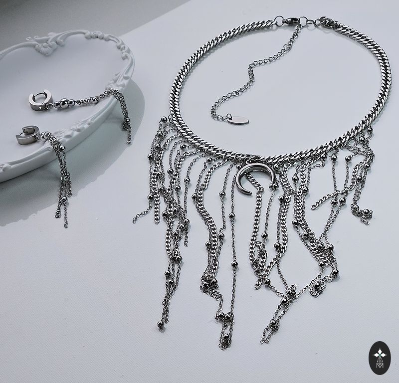 Materjal-granaat, hematiit, roostevaba terasest furnituur. Kaelakee pikkus 41cm, koos pikendusketiga kuni 51cm. Käevõru kahekordse kummiga 17cm.