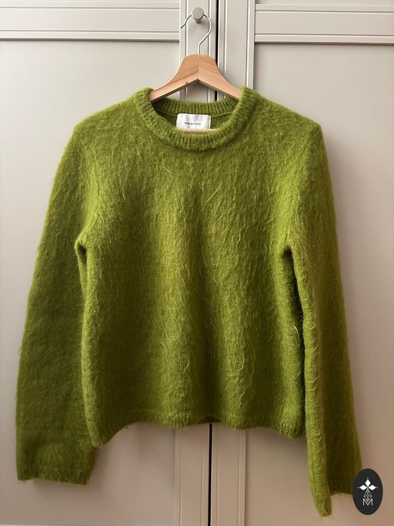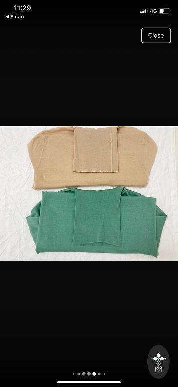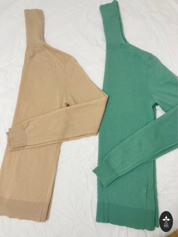 Kootud pikkade varrukatega kampsun, soonikuga kaelus, madalalt langevad õlad ja soonik mansettidel ning allääres.