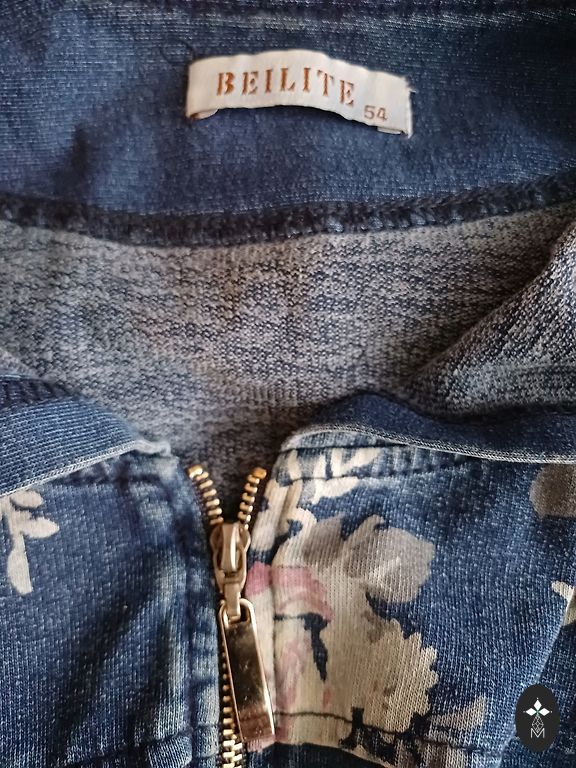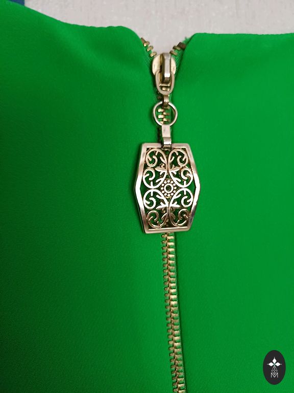 šoniniai kišeniai su kontrastingais auksiniais užtrauktukais, kurie suteikia ryškumo įvaizdžiui.